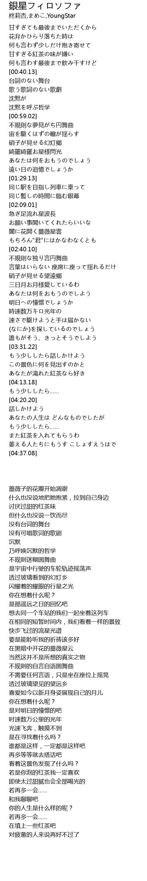 | [02:21.06] | 急ぎ足流れ星波長 |