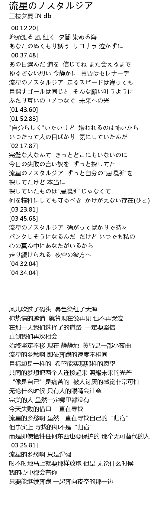 | [03:47.68] | 流星のノスタルジア 強がってばかりで時々 |