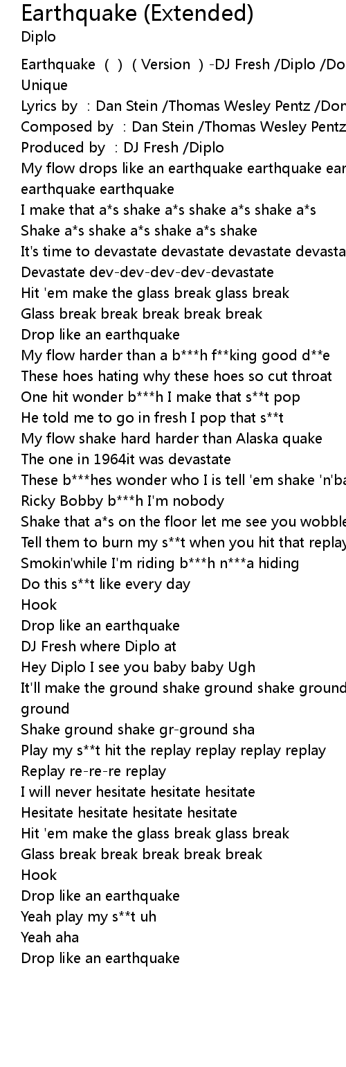 | [00:00.00] | Earthquake ()(Version )-DJ Fresh /Diplo /Dominique Young Unique |