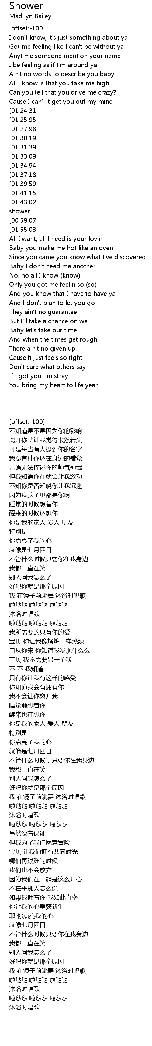 | [00:45.25][01:43.02][02:47.33] | I'm dancing in the mirror and singing in the shower |