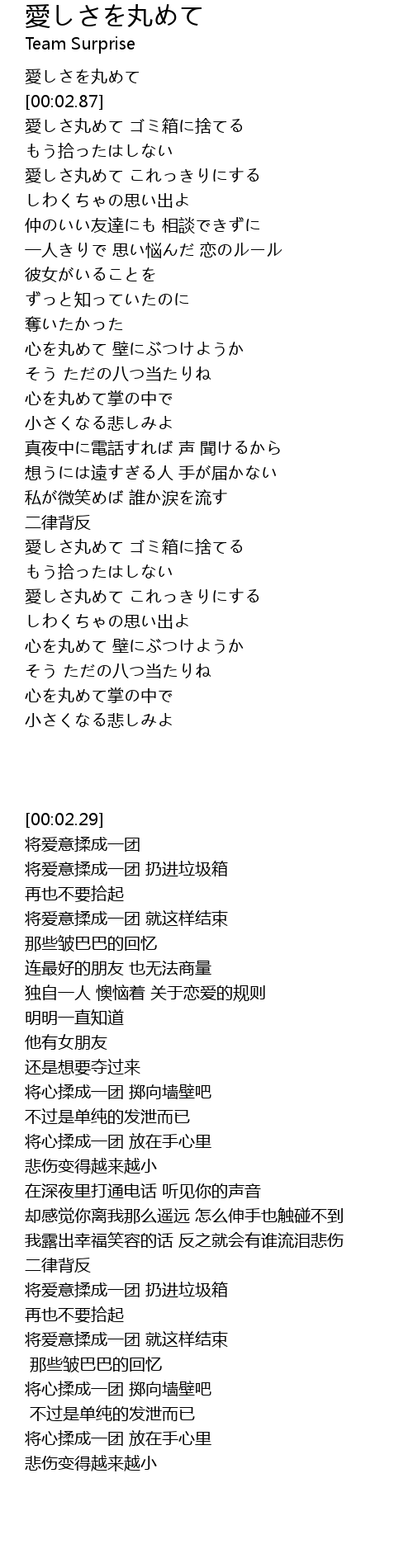 | [00:20.85] | 愛しさ丸めて これっきりにする |