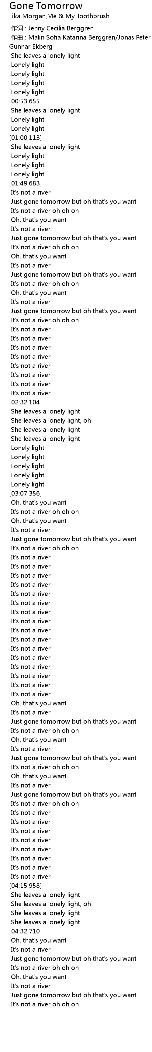 | [05:00.226] | Just gone tomorrow but oh that' s you want |