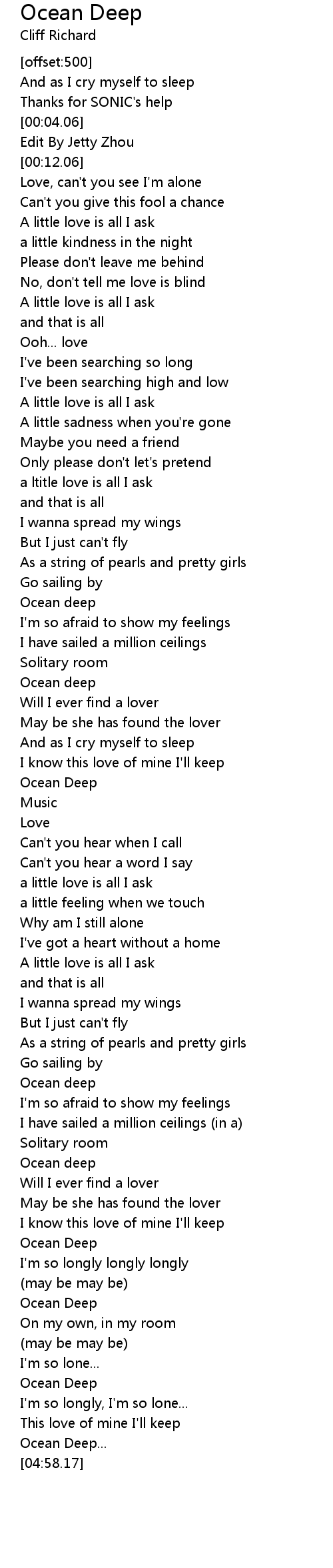 | [01:57.18] | Ocean deep |