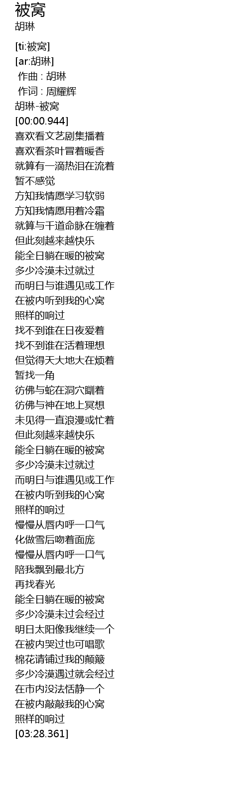 | [00:00.333] | 胡琳-被窝 |