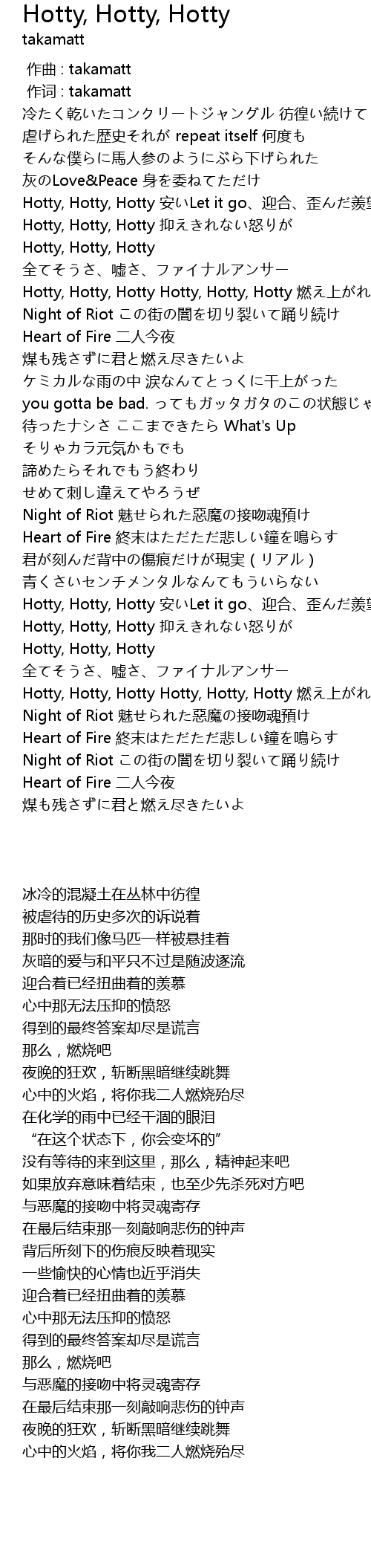 | [02:24.78] | Hotty, Hotty, Hotty Hotty, Hotty, Hotty 燃え上がれ |