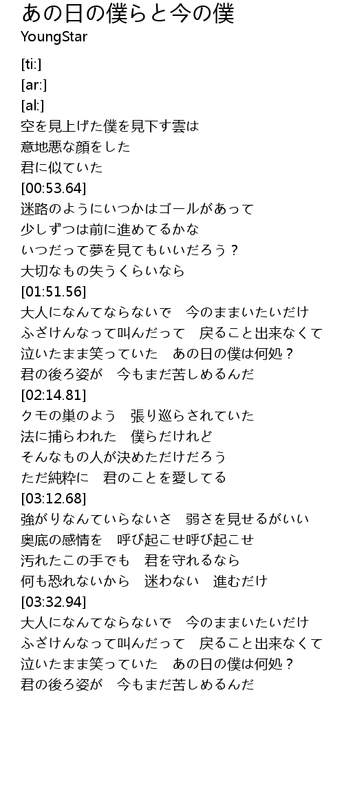 | [03:33.44] | 大人になんてならないで 今のままいたいだけ |