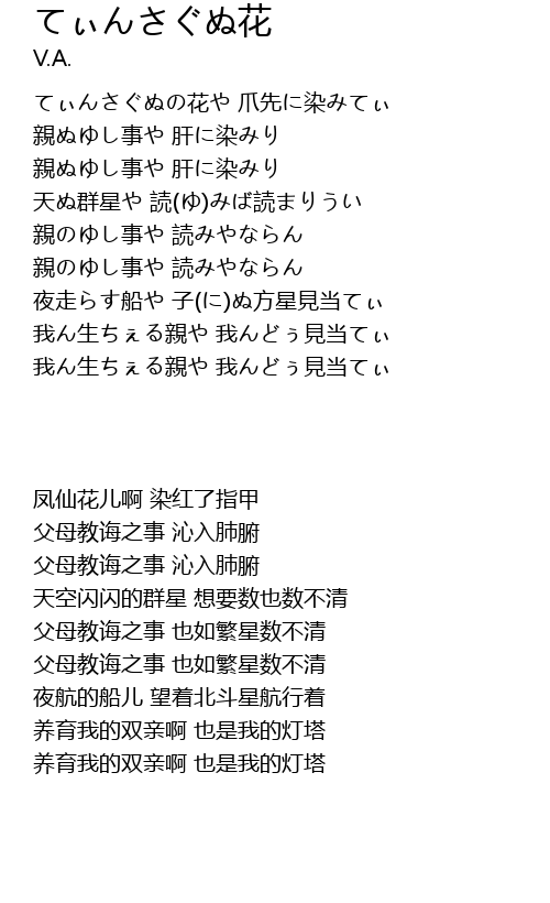 | [00:22.560] | てぃんさぐぬの花や 爪先に染みてぃ |