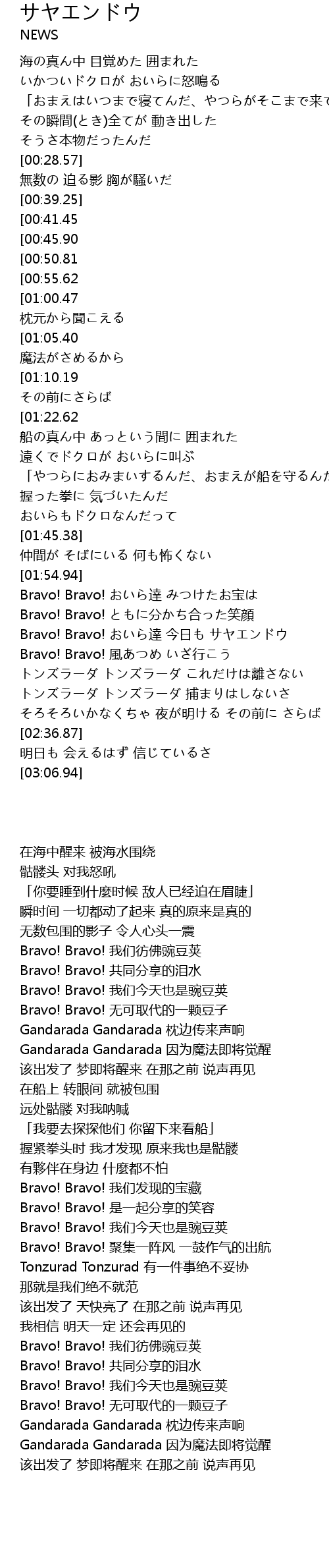 | [03:12.23][00:45.90] | Bravo! Bravo! ともに分かち合った涙 |