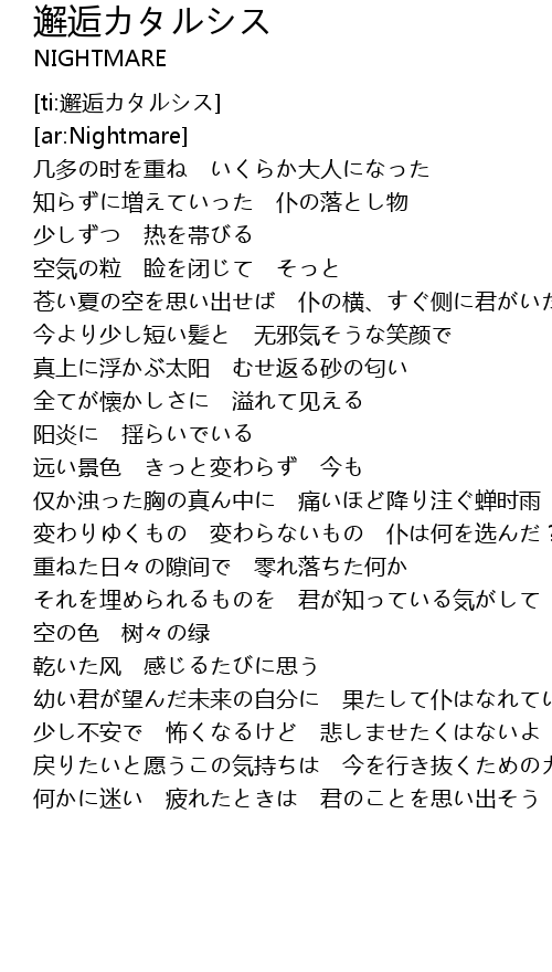 | [03:55.261] | 戻りたいと愿うこの気持ちは 今を行き抜くためのカタルシス |