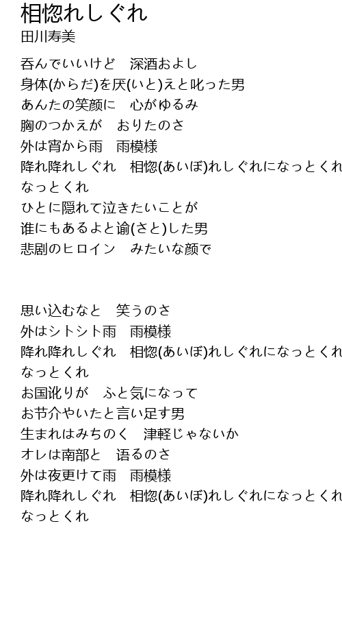 | 降れ降れしぐれ 相惚(あいぼ)れしぐれになっとくれ | |