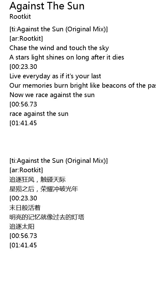 | [00:40.16][00:56.73][01:02.26][01:34.91][01:45.79][01:52.17][01:57.17] | Now we race against the sun |