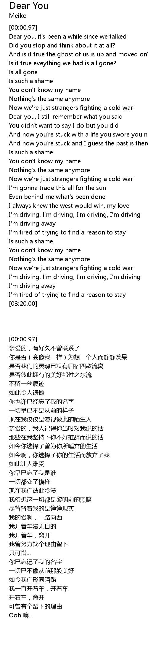 | [00:11.49] | Dear you, it's been a while since we talked |