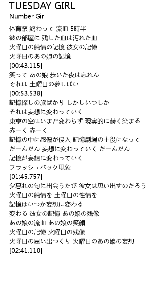 | [00:34.756] | 火曜日の純情の記憶 彼女の記憶 火曜日のあの娘の記憶 |