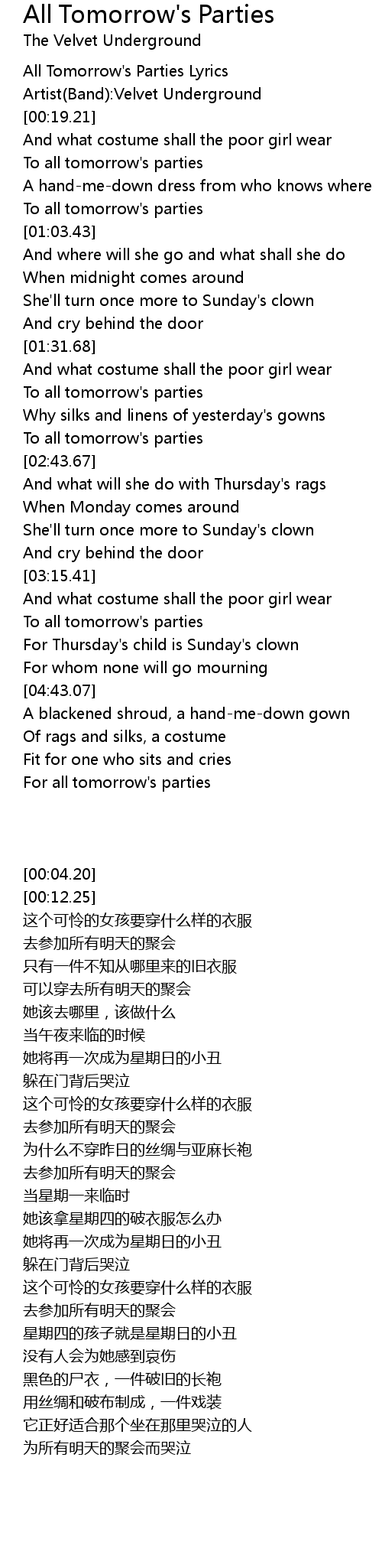 [00:04.20] All Tomorrow's Parties Lyrics