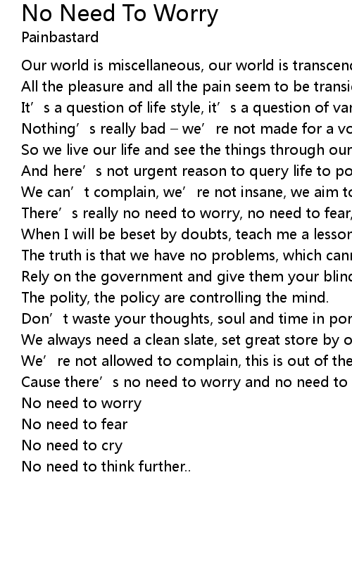 | There' s really no need to worry, no need to fear, no need to cry. | |