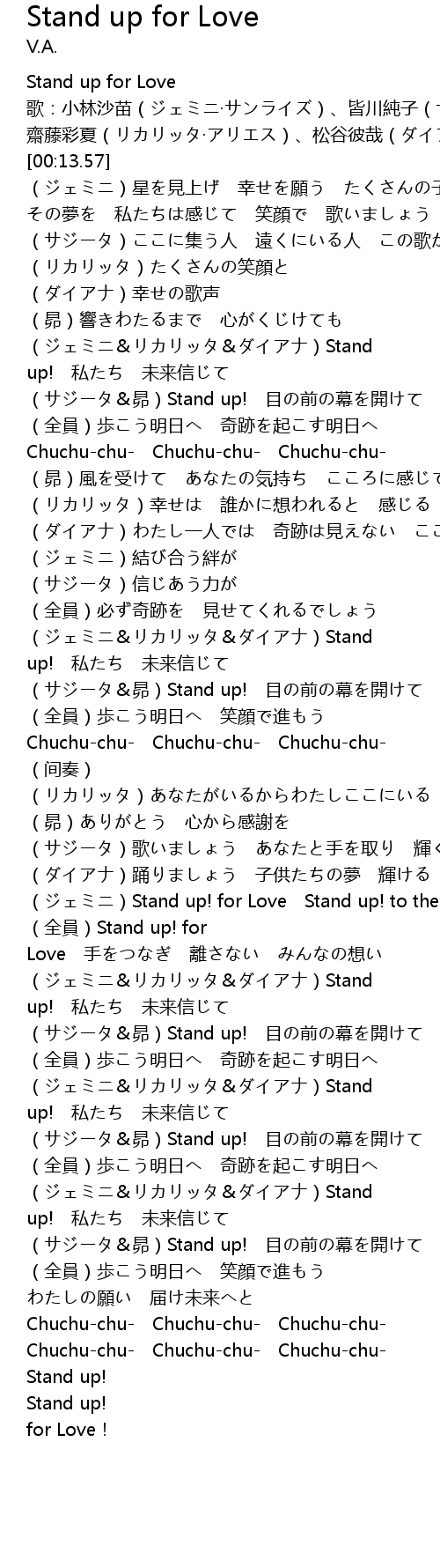 | [02:00.93] | (ジェミニ&リカリッタ&ダイアナ)Stand up! 私たち 未来信じて |