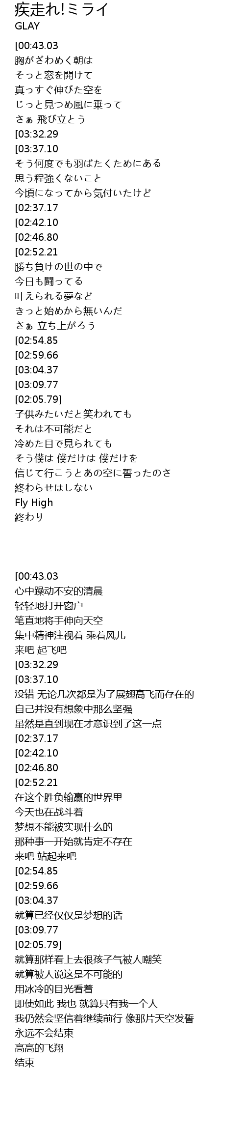 | [00:25.10][03:32.29] | Fly High僕の胸の中の |