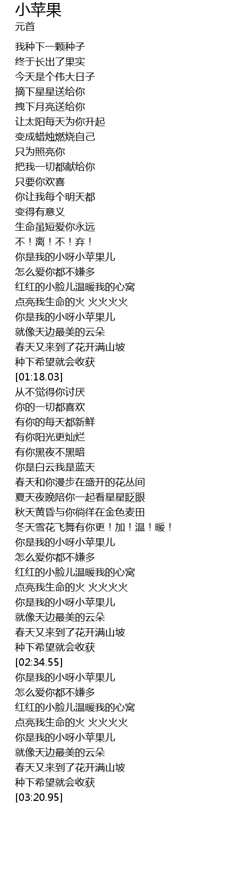 | [02:19.62] | 你是我的小呀小苹果儿 |