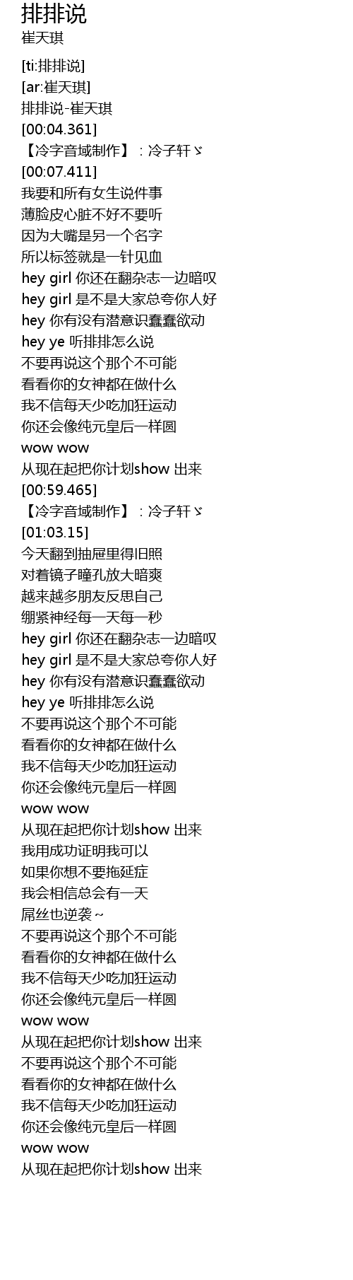 | [00:00.361] | 排排说-崔天琪 |