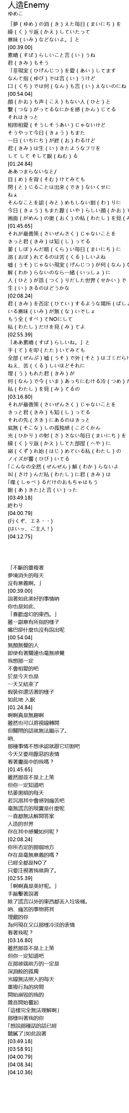 | [03:00.85] | 全部(ぜんぶ)嘘(うそ)で外(そと)はゴミだらけ |