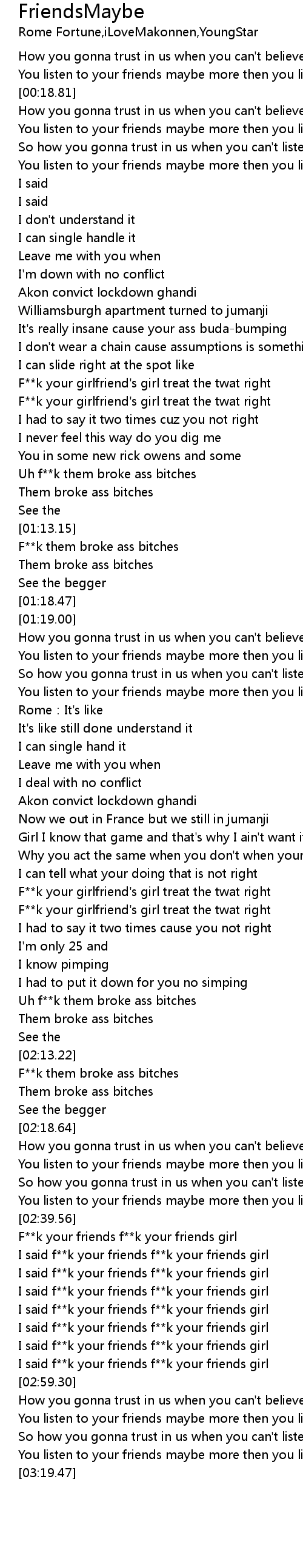 | [02:44.92] | I said f**k your friends f**k your friends girl |