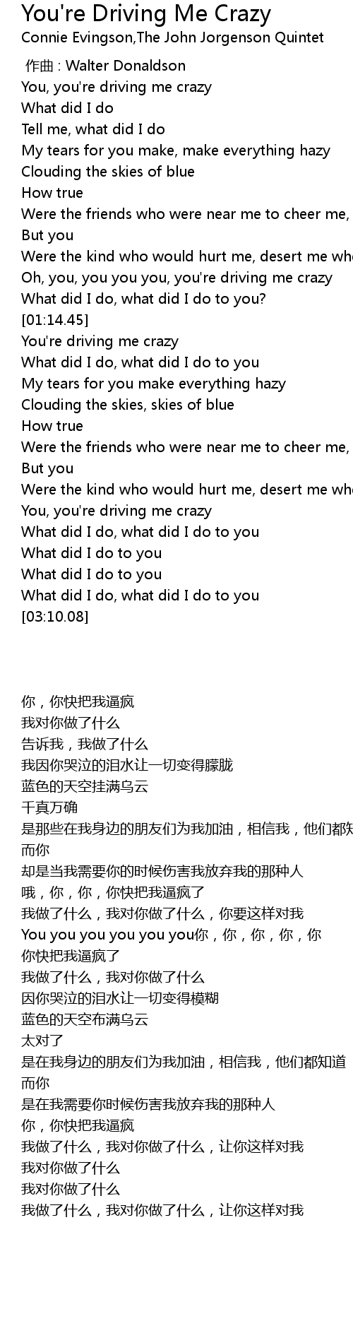 | [00:40.52] | You, you're driving me crazy |