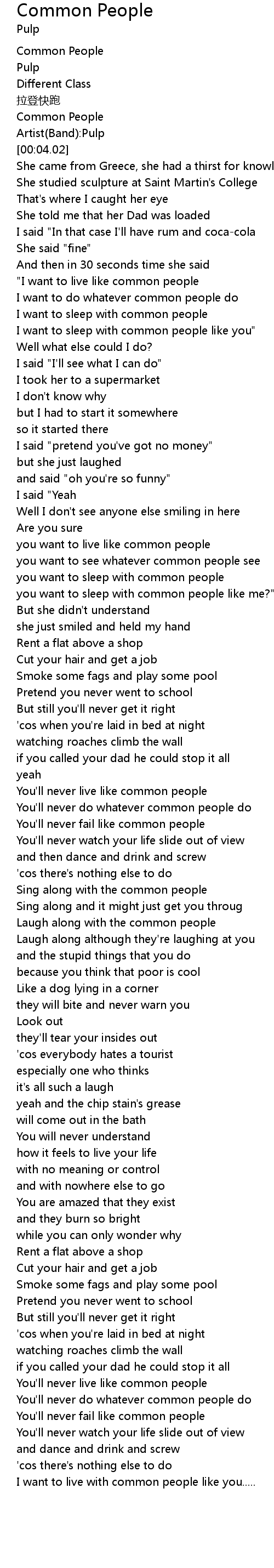 | [00:46.57] | I want to sleep with common people like you" |