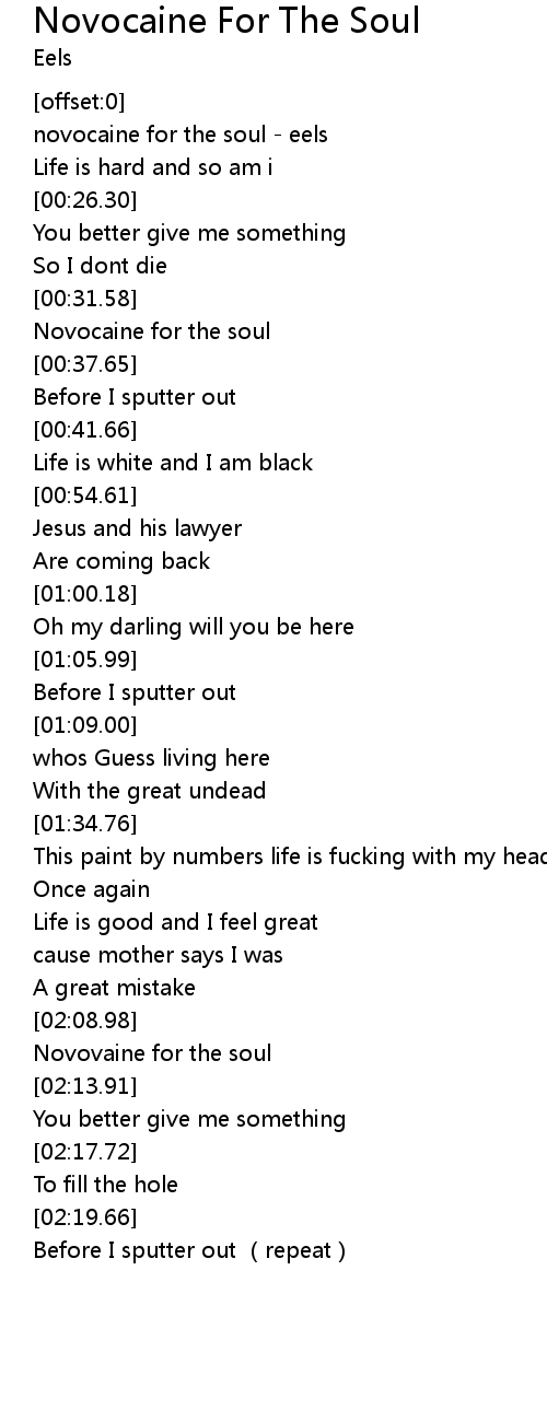 | [00:33.77] | Novocaine for the soul |