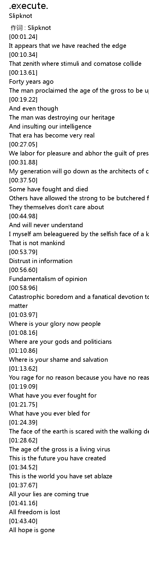 | [01:25.67] | The face of the earth is scared with the walking dead |