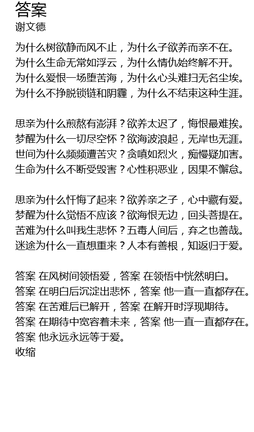 | 为什么树欲静而风不止,为什么子欲养而亲不在。 | |