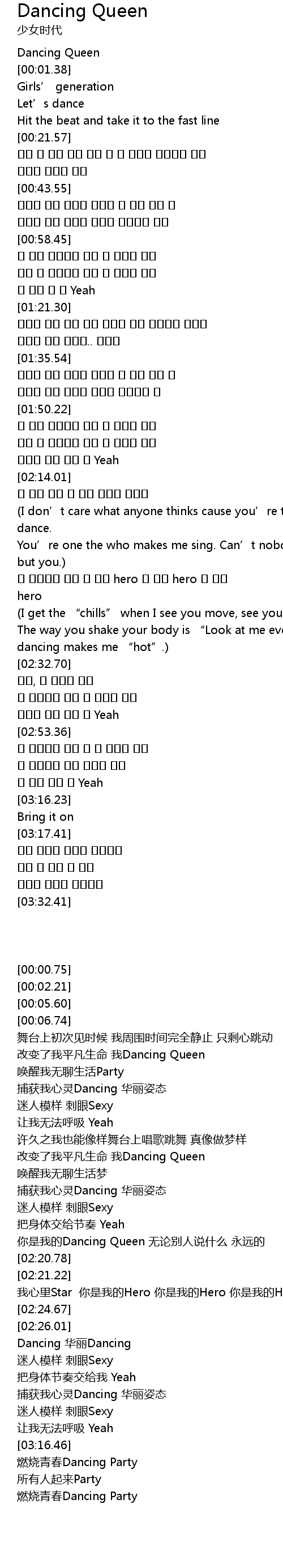 | [02:21.22] | You' re one the who makes me sing. Can' t nobody be my dancing queen but you. |