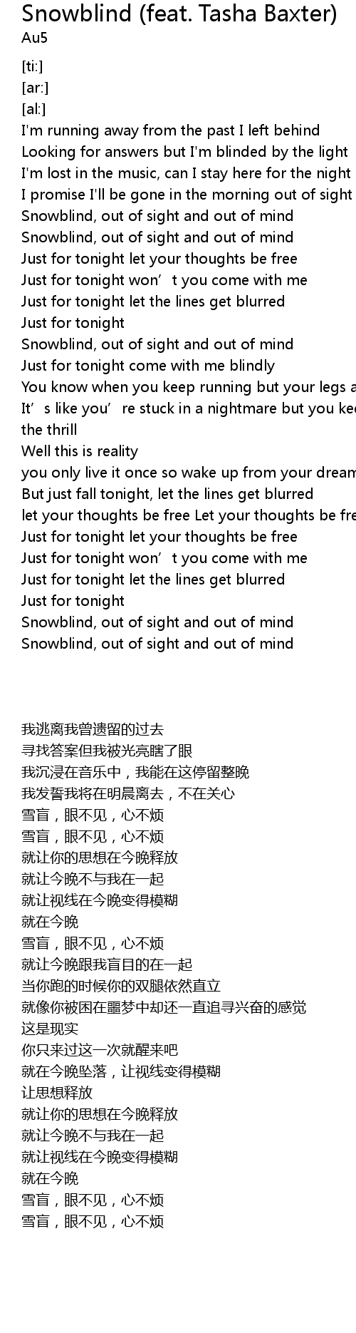 | [00:46.75] | Snowblind, out of sight and out of mind |