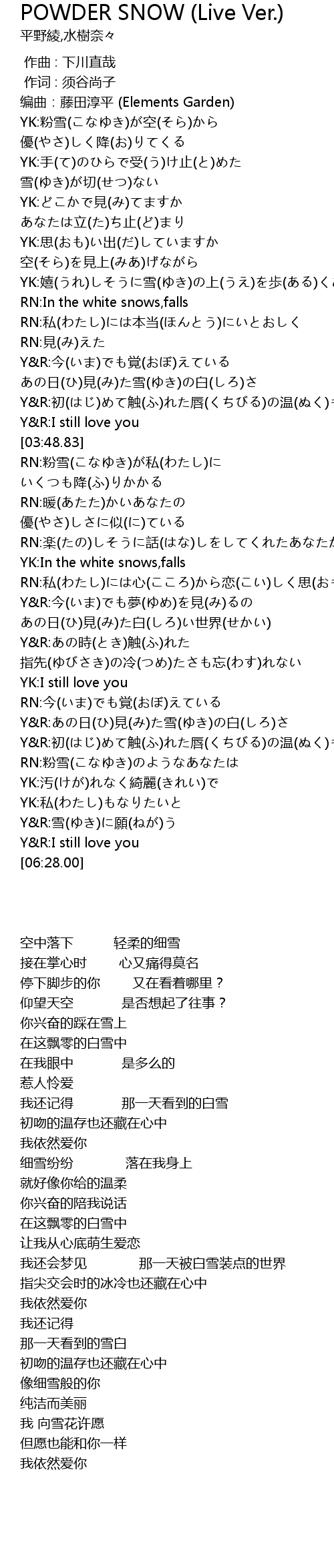 | [03:21.21] | Y&R:今(いま)でも覚(おぼ)えている あの日(ひ)見(み)た雪(ゆき)の白(しろ)さ |