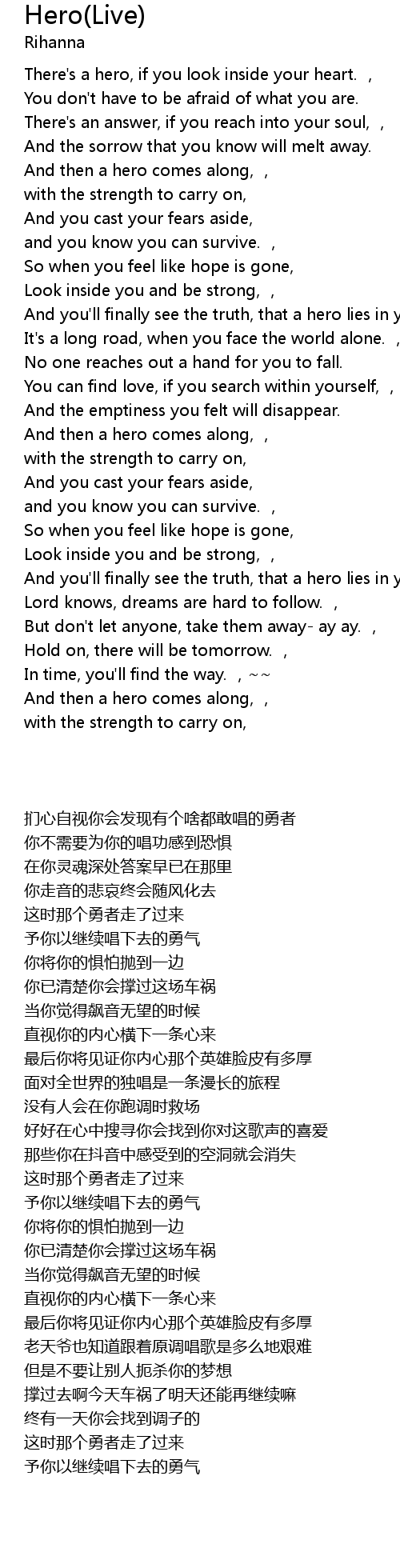 | [00:01.690] | There' s a hero, if you look inside your heart. , |