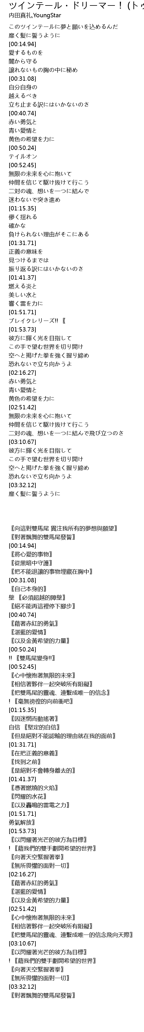 | [00:01.94] | このツインテールに夢と願いを込めるんだ |