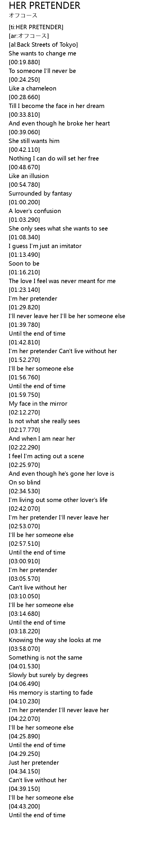 | [04:14.350] | I'm her pretender I'll never leave her |