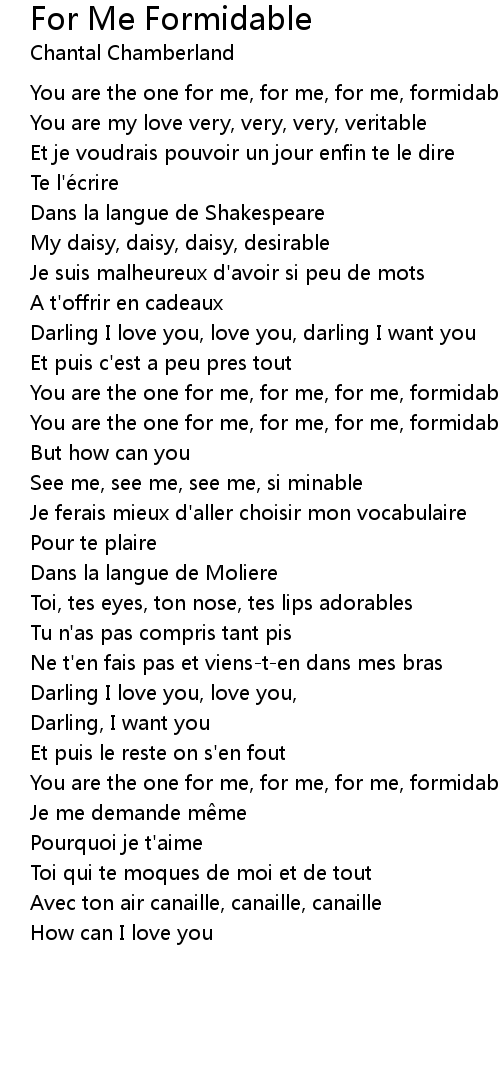 | [00:12.448] | You are the one for me, for me, for me, formidable |