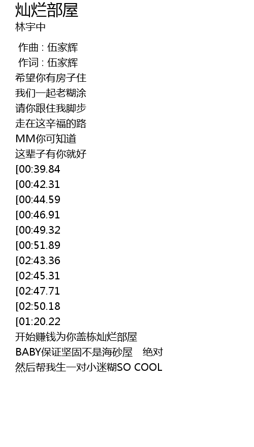 | [02:59.46][02:50.18][02:40.78][02:31.34][02:03.03][01:53.66][01:13.66][01:04.21] | 灿烂的屋 Wo… |