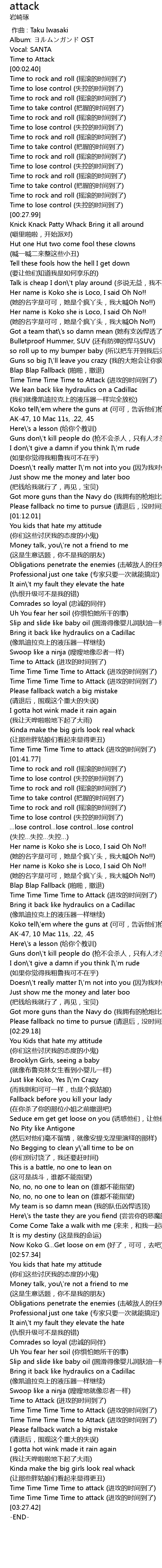 | [00:53.18] | Time Time Time Time to Attack (进攻的时间到了) |