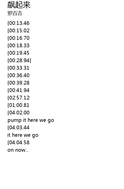 | [04:06.81][04:03.44][04:00.22][03:56.92][03:53.66][03:50.37][03:47.03][03:43.81][02:29.81][02:26.54][02:23.21][02:19.92][02:16.66][02:13.35][02:10.04][02:06.77] | pump it here we go |