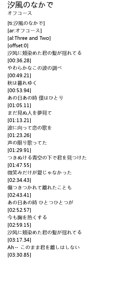 | [00:23.17] | 汐风に颊染めた君の髪が揺れてる |