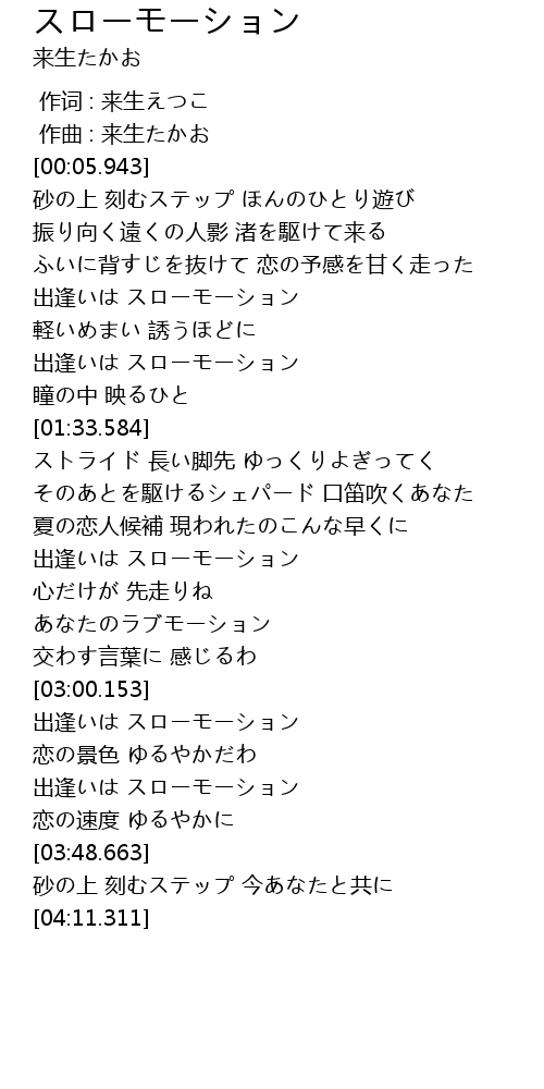 | [03:41.427] | 恋の速度 ゆるやかに |