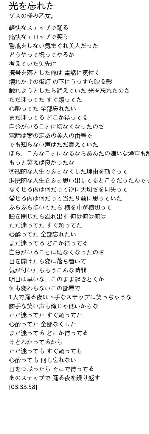 | [00:50.81] | 心酔ってた 全部忘れたい |