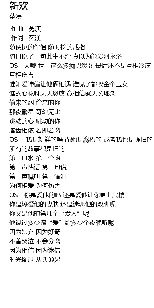 | [01:35.55] | OS: 我是新鲜的吗 而她是腐朽的 或者我也是陈旧的 所有的故事都是旧的 |