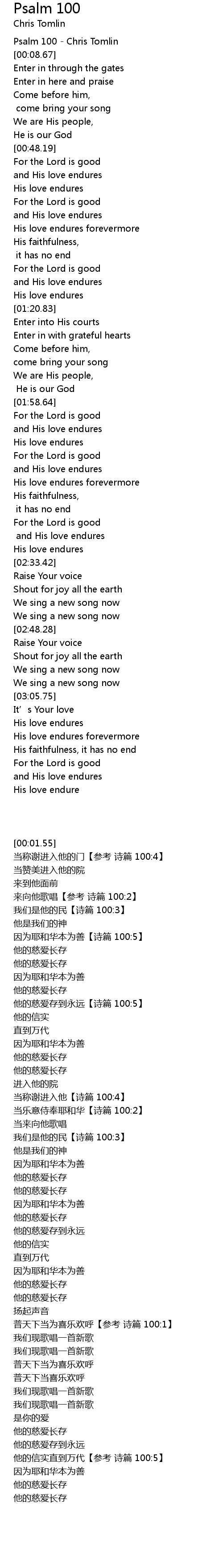 | [00:01.55] | Psalm 100 Chris Tomlin |
