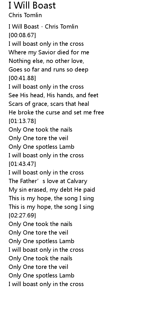 | [00:01.55] | I Will Boast Chris Tomlin |