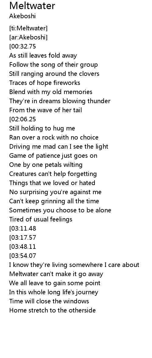 | [00:01.99][00:32.75][00:45.26][00:50.97][01:03.54][01:09.31][01:15.06][01:22.03][01:44.05][01:56.77][02:02.21][02:14.66][02:20.81][02:26.43][02:32.82][02:49.95][03:14.77][03:20.75][03:26.81][03:33.45][03:39.15][03:45.49][03:51.23][03:57.81] |