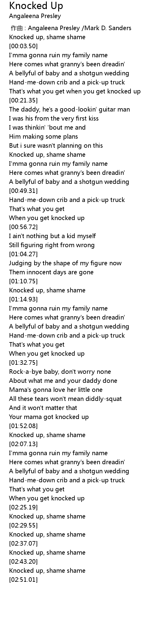 | [02:39.83] | Knocked up, shame shame |