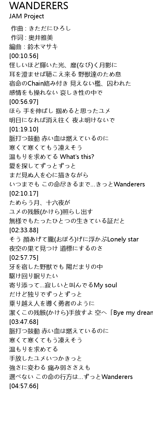 | [01:56.28] | いつまでも この命尽きるまで…きっとWanderers |