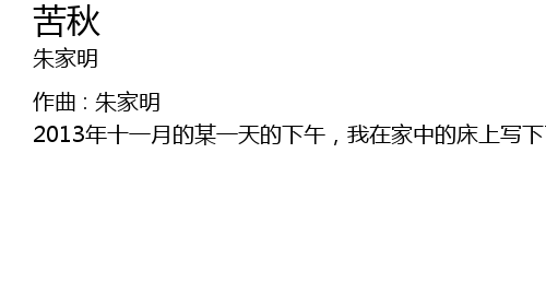 | 2013 nián shí yī yuè de mǒu yì tiān de xià wǔ, wǒ zài jiā zhōng de chuáng shàng xiě xià le kǔ qiū de xuán lǜ. hòu yòu zuò le jǐ chù xiū gǎi. zài yī kōng jiān de lù yīn shì wǒ yāo qǐng le zhōng yāng mín zú yuè tuán shǒu xí èr hú jīn yuè bāng wǒ wán chéng le zhè duàn xuán lǜ. wǒ xiān dǎ le dǐ, jīn yuè yī gòng lù le 3 gè bǎn běn, chū xiàn zài chàng piān lǐ de shì dì 2 gè bǎn běn. bì xū chéng rèn, zhè duàn xuán lǜ zài bù duàn chóng fù jiā shēn zhe wǒ de huí yì, fēi cháng zì rán de ràng rén xiǎng qǐ guò qù, xiǎng qǐ céng jīng de rén, suī rán zhè zhǒng fēn wéi shì lüè wēi bēi chóu de, dàn shì duì wǒ què shì duì xīn líng de yī cì zī rùn. |